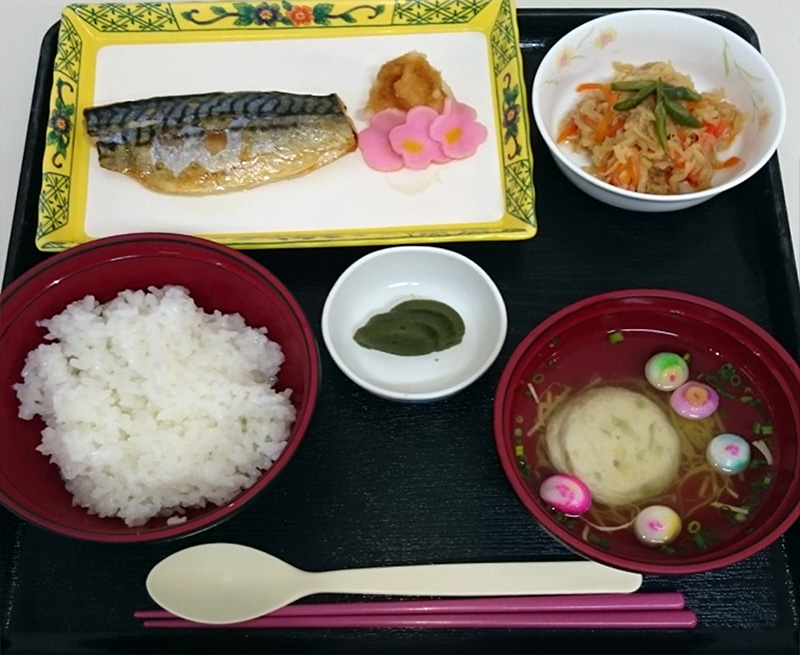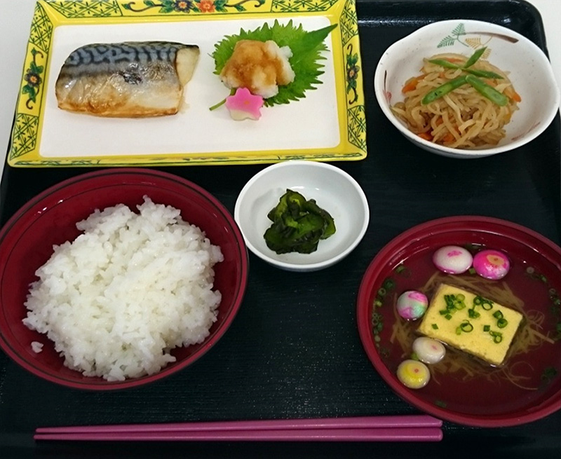 お正月のおせち料理は、多様な食材を使用してお正月気分を感じてもらえるように、また行事食だけではなく季節の食材を取り入れ、風味・色彩豊かになるように心がけております。 |